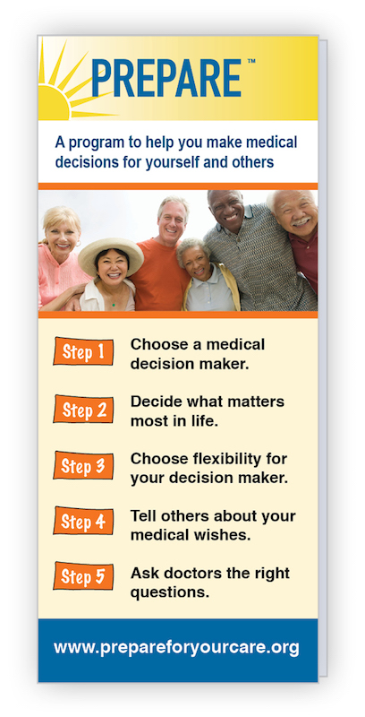 PREPARE materials are free to the public. It is OK to provide the "PREPAREforYourCare.org" URL in written or web-based materials and to print materials directly from the PREPARE website. Licensing is required from the UC Regents to include any PREPARE PDFs or any PREPARE content or materials on other websites or within other materials. Derivative works are not allowed. Licensing is also required for the use of any PREPARE content, materials, or pdfs in quality improvement and/or research projects, as well as for white labeling (branding) or data reporting. For more information, please see the PREPARE Terms of Use and Licensing Options.